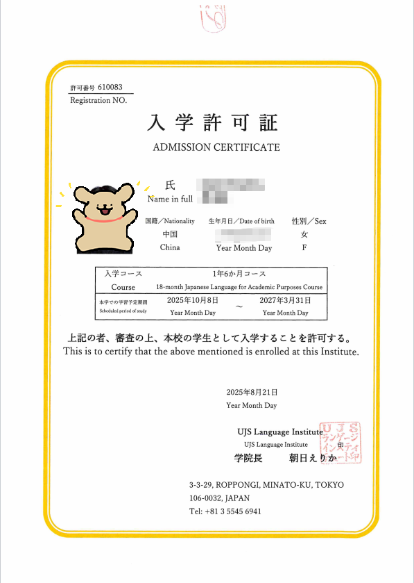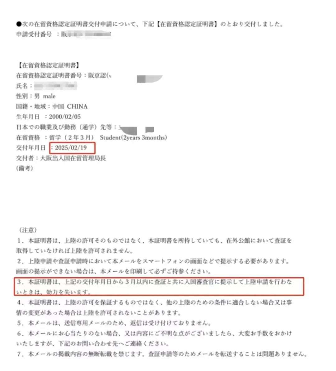 有的学校如果申请的是电子交付的话,是没有我们常见的在留资格认定证明书的,是以邮件的形式通知,上面记载了个人信息。