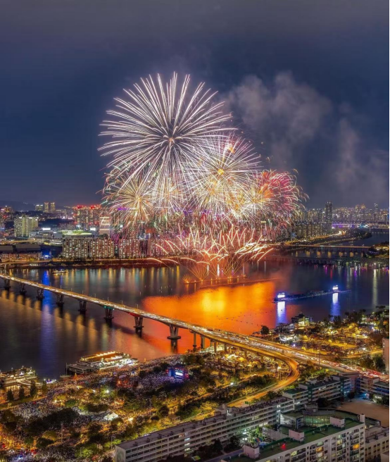 若偏爱轻松氛围,汝矣岛汉江公园是选择。跨年夜22:00,音乐喷泉率先开启预热模式,23:55的烟花表演将氛围推向高潮,绚烂光影倒映在江面上,美到让人失语。当地人会带着炸鸡、啤酒和野餐垫,在公园内围坐畅谈,周边还有美食车和露天演唱会,全家老小都能找到乐趣。
