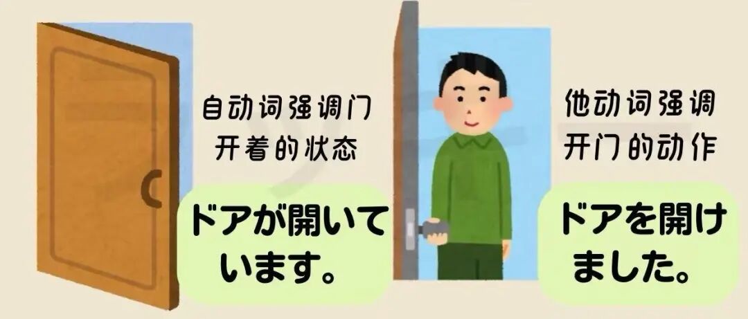 · “我开门”(强调“我”的动作)→ 对应日语他动词